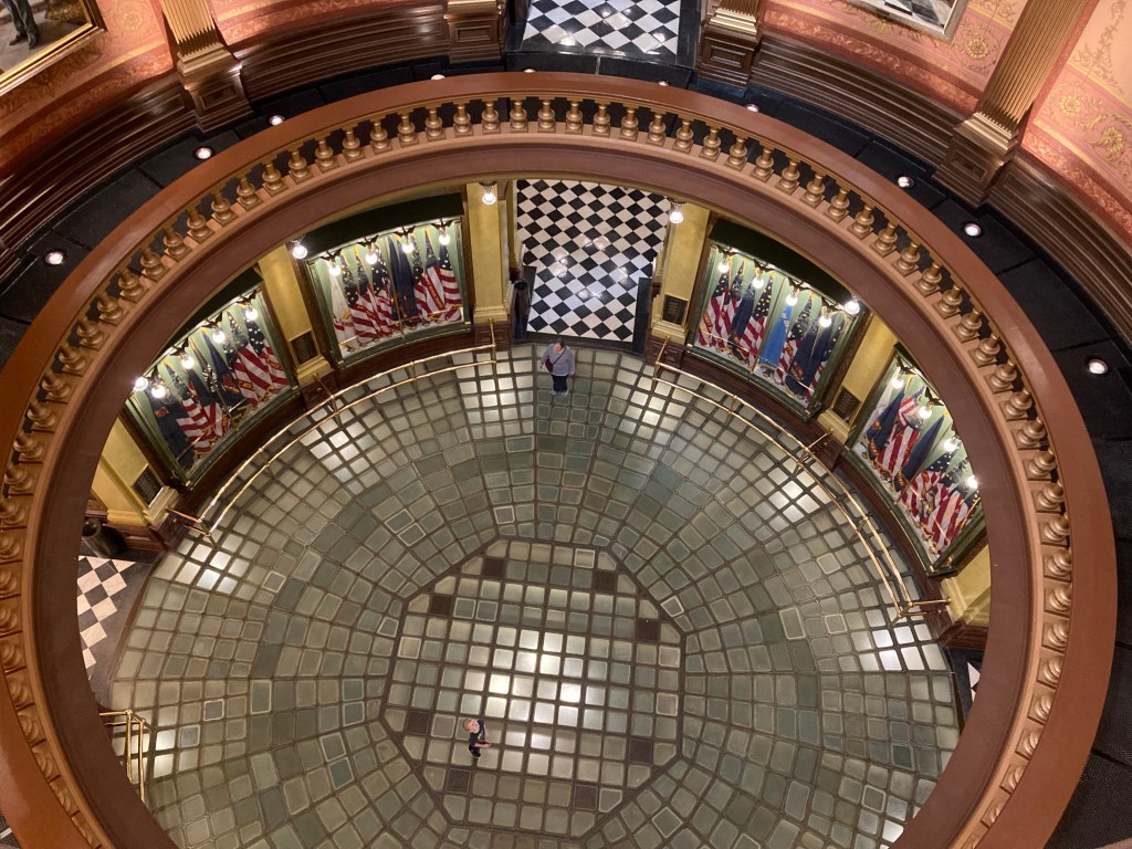 In the early 1980s I was a student at Michigan State University majoring in journalism. As part of my minor in political science, I did an internship at the Michigan capitol in Lansing with my State Representative. A couple mornings each week I worked in his office on the ground floor of the capitol. I became very familiar with the capitol building as I attended hearings, committee meetings and visited the offices of other legislators. One of my favorite spots was to stand on the glass floor under the dome and look up at the stars painted high above on the interior dome.